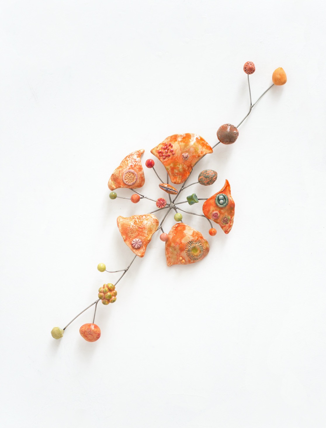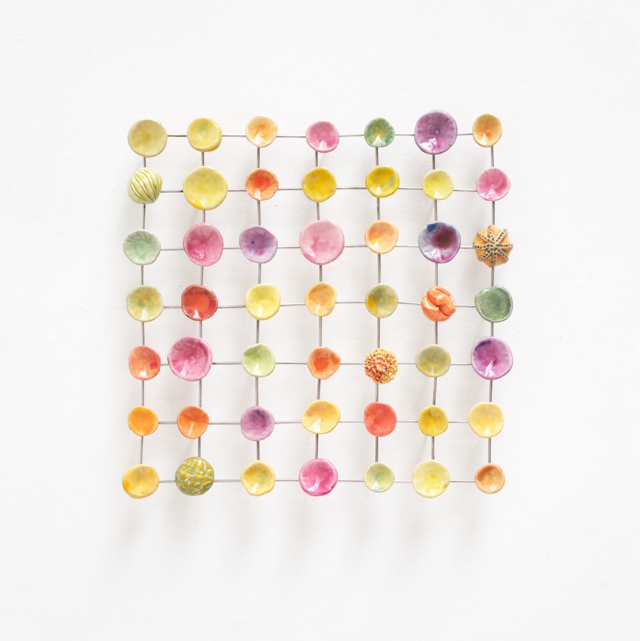 The ceramic elements scattered across the linear structures act as visual nodes, energizing the work and adding rhythm and layers, fragile yet full of vitality.