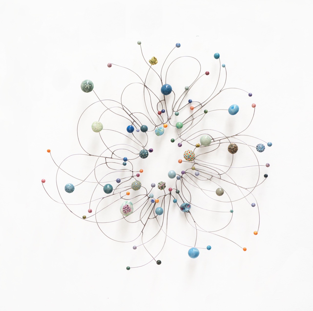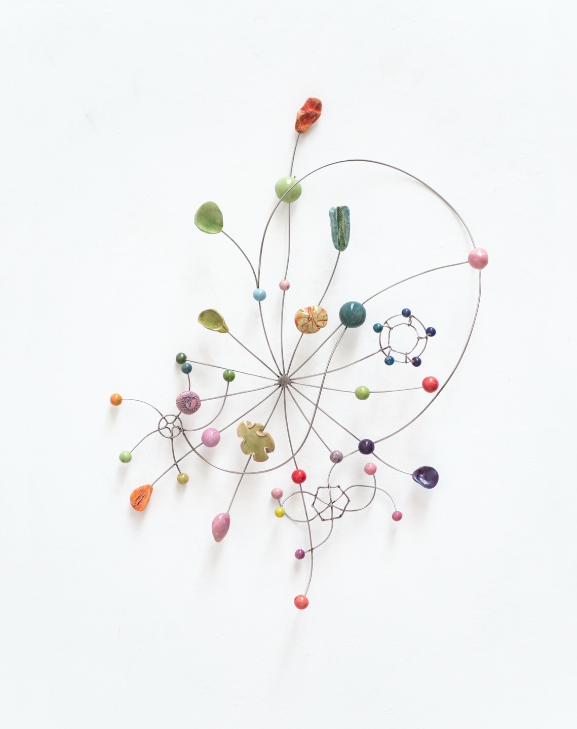 Combining stainless steel and ceramic elements, his works are airy and rhythmic, engaging with form, color, and natural patterns to invite viewers to experience the fragility and beauty of existence.